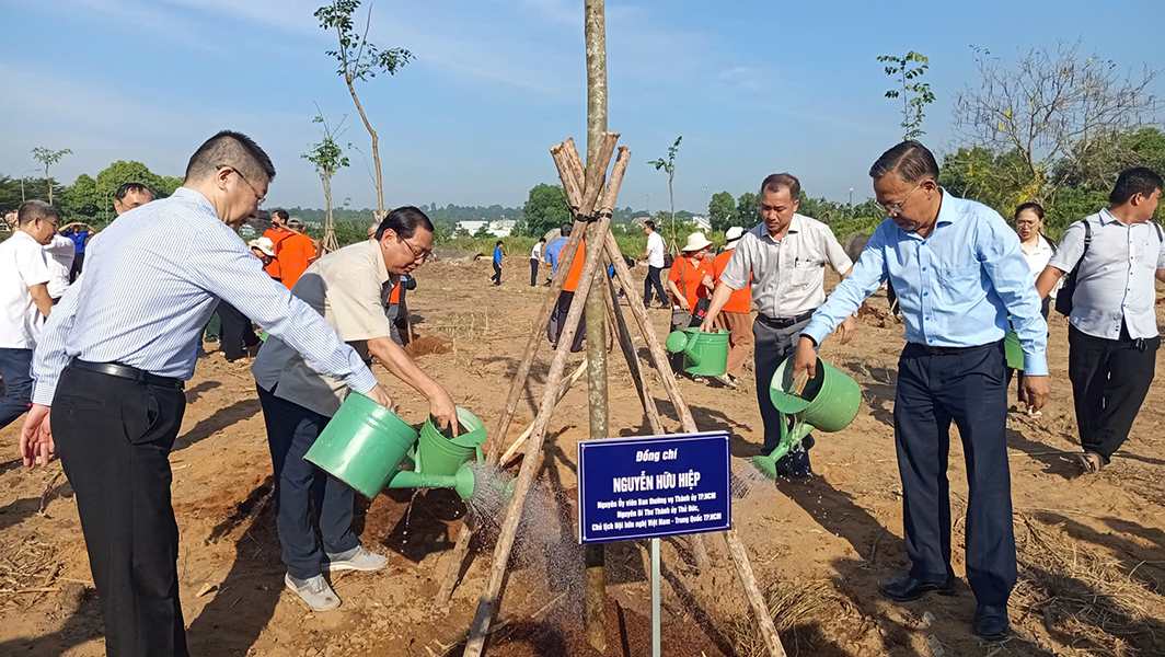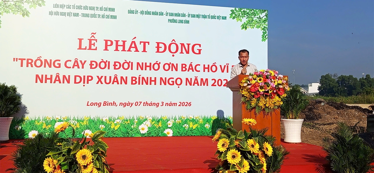 Sáng ngày 07/03/2026; UBND – Ủy ban Mặt trận Tổ quốc Việt Nam phường Long Bình đã phối hợp với Hội Hữu nghị Việt Nam – Trung Quốc TP.HCM và Liên hiệp các tổ chức Hữu nghị TP.HCM tổ chức chương trình “Trồng cây đời đời nhớ ơn Bác Hồ vĩ đại” nhân dịp Xuân Bính Ngọ năm 2026, tại Vườn cây quà tặng phường Long Bình.